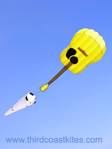 |   Post Date : Apr 20, 2012 22:30:59 |  Usually ships in 1-2 business daysWhether you're a rock star wannabe or just like to turn heads on the flying field, Martin Blais' Air Guitar does the trick. From the spinning drogue tail, to the Mylar laminate frets, it's all about showmanship. A nice, high angle flier, this soft parafoil kite needs no assembly and packs easily into its 21" x 14" nylon stuff sack. 4'-6" x 11'-8Ɗ. Wind range: 5 to 20 mph. Use 150-lb. Dacron line.