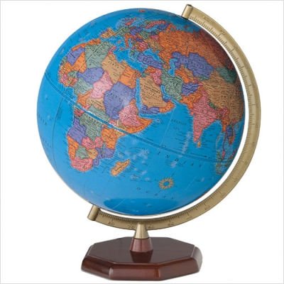 This attractive 12" raised relief political globe ball graces any table. The blue oceans globe ball graces any table. Set in a champagne toned die cast metal semi-meridian and cherry finished octagon base.